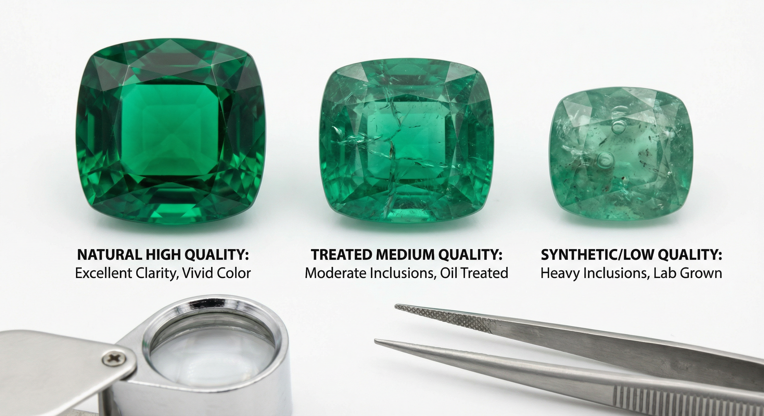 Jeweller's desk showing valuation tools: magnifying glass over hallmarks, gemstone chart, precision scale, and era identification cards with antique jewellery