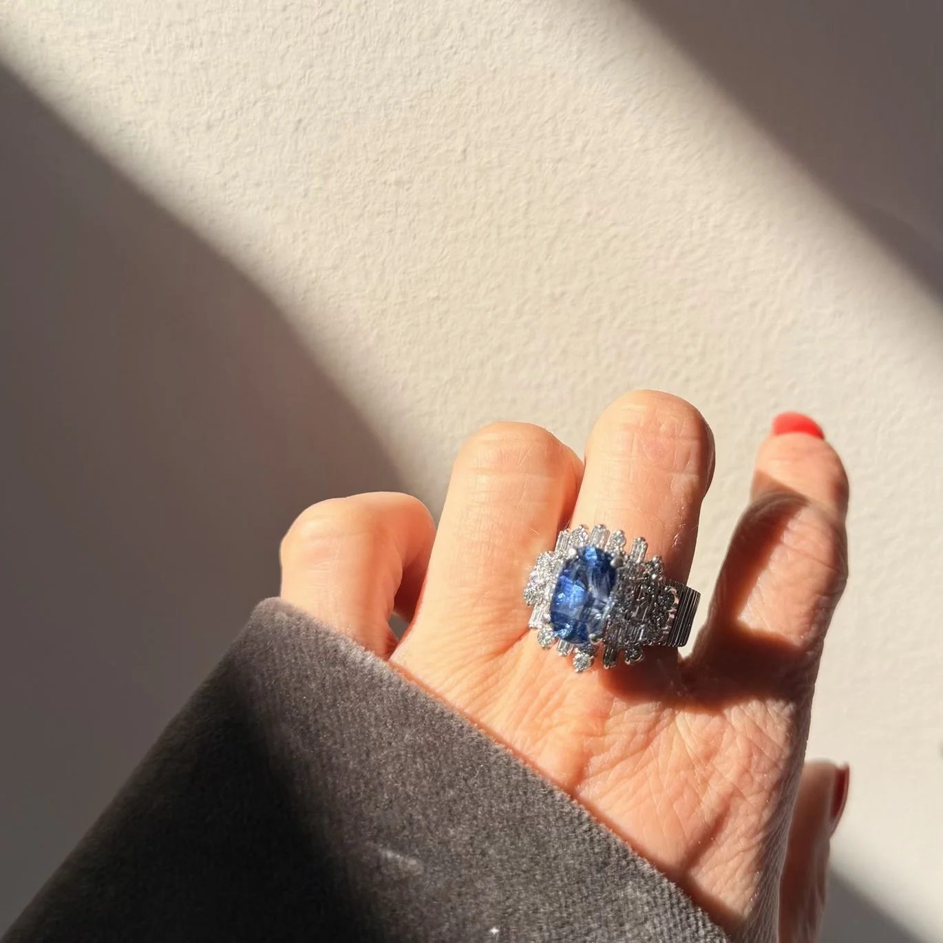 A refined platinum ring set with a natural cushion cut Ceylon sapphire weighing 5.26 carats, accented by diamonds to the shoulders. The sapphire displays an attractive blue tone and is mounted in a classic setting that keeps the focus on the centre stone. Elegant and wearable, this is a fine sapphire ring with strong presence and a clean, balanced design.