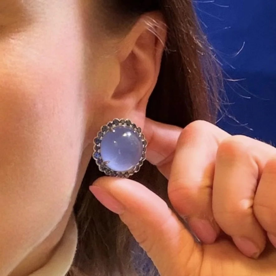 A bold pair of vintage clip earrings crafted in solid 18KT yellow gold, dating to the 1970s. Each earring centres on a large round cabochon chrysoberyl of soft, luminous tone, framed by a scalloped halo of round brilliant-cut blue sapphires. The strong scale, saturated colour contrast, and sculptural gold mounts are characteristic of high-quality 1970s jewellery, designed for impact and presence. A striking and substantial pair with excellent gemstone weight and period character.