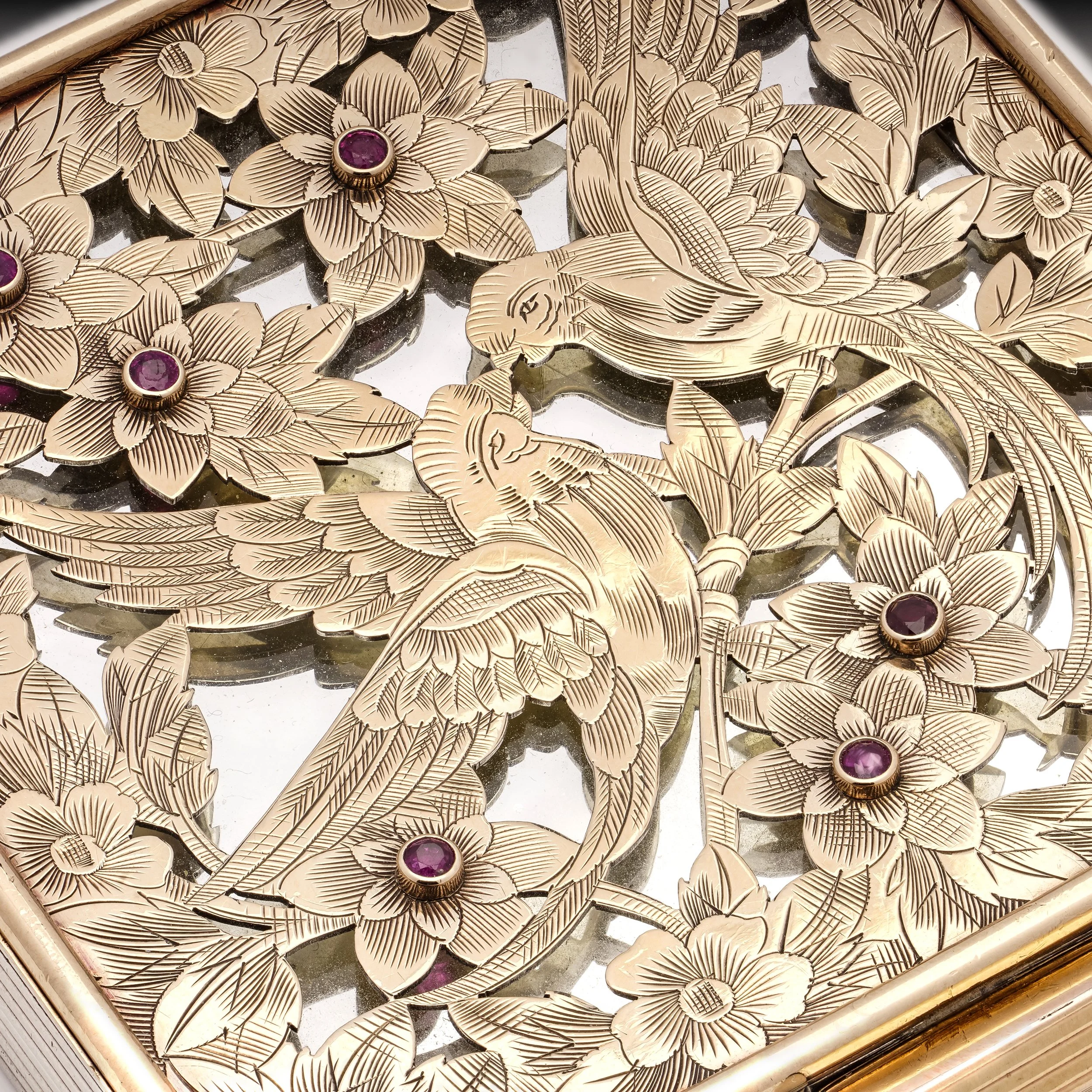 Boucheron Mid-20th century sterling silver and 18kt. rose gold compact case, set with cabochon rubies and decorated with two birds and floral motifs.